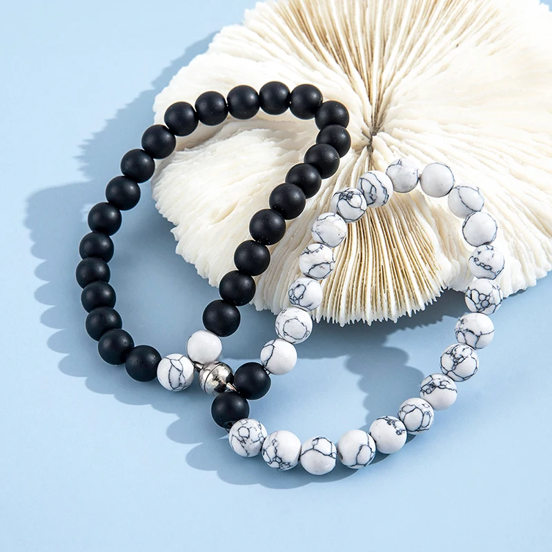 Браслеты выполнены из натурального камня и крепкого бижутерного сплава на магнитах. Размер является универсальным засчет эластичной веревки.
